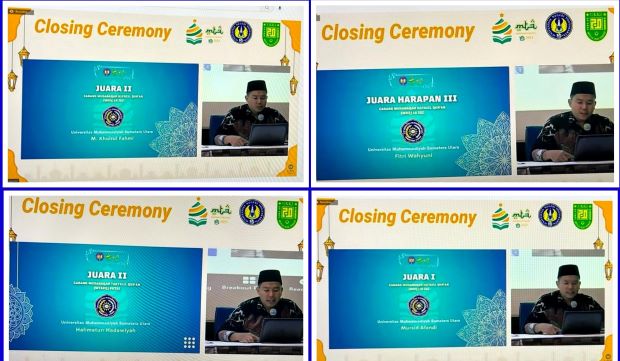 TAJDID.ID || Empat mahasiswa Universitas Muhammadiyah Sumatera Utara (UMSU) meraih prestasi pada ajang MTQ Nasional Mahasiswa 2023 di Universitas Negeri Yogyakarta. Mereka adalah Mursyid Affandi sebagai juara I, Khoirul Fahmi Juara II dan Fitri Wahyuni Juara harapan 3 pada cabang Hifzil Quran 10 juz serra Halimatun Hadawiyah meraih juara II untuk cabang Tartil Quran.