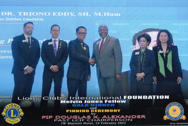 Pin kehormatan ini diserahkan langsung oleh Past LCIF Chairperson, PIP Douglas X Alexander dalam acara Gala Dinner dan Pinning Ceremony di JW Marriott Hotel, 19 Februari 2025.