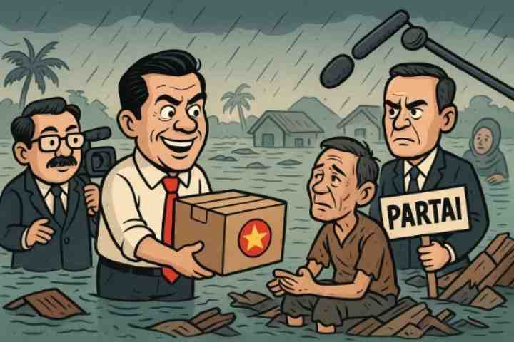 Banjir besar di Sumatera kembali mengingatkan publik pada pola lama: bencana datang, elite bergerak cepat, bukan untuk membenahi akar kerusakan, melainkan menguasai ruang kamera. Desa-desa yang porak-poranda berubah menjadi panggung, sementara para pengungsi duduk sebagai latar peran. Dalam jam-jam awal pascabencana ketika warga masih mencari keluarga yang hilang, sejumlah politisi sudah mengunggah foto, video, dan paket bantuan lengkap logo partai.