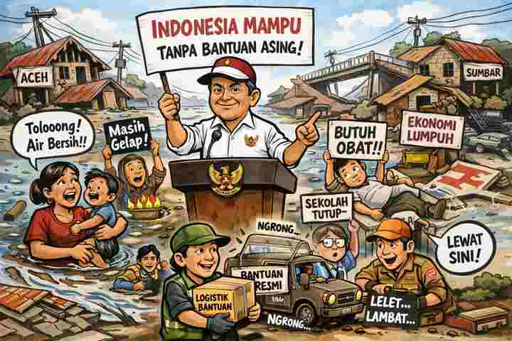 Negara memilih kalimat yang tegas di tengah bencana: Indonesia mampu menangani musibah di Aceh, Sumatra Utara, dan Sumatra Barat tanpa bantuan asing. Pernyataan itu terdengar meyakinkan. Ia menenangkan di tingkat wacana. Namun bencana tidak hidup di wacana. Ia hidup di rumah-rumah yang terendam, di jalan yang terputus, dan di tubuh warga yang menunggu terlalu lama.