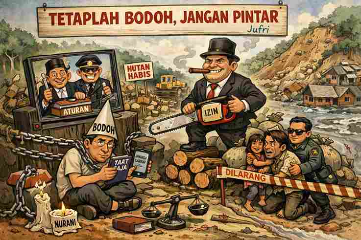Kebingungan itu bukan kebetulan. Bahasa hukum dibuat rumit, sosialisasi minim, pendidikan publik diabaikan. Akibatnya, rakyat mudah disalahkan karena dianggap tak paham, padahal ketidaktahuan itu dipelihara. Pohon dan tidak pohon bisa berubah makna, tergantung siapa yang berbicara. Hukum tampak lentur ke atas, kaku ke bawah.