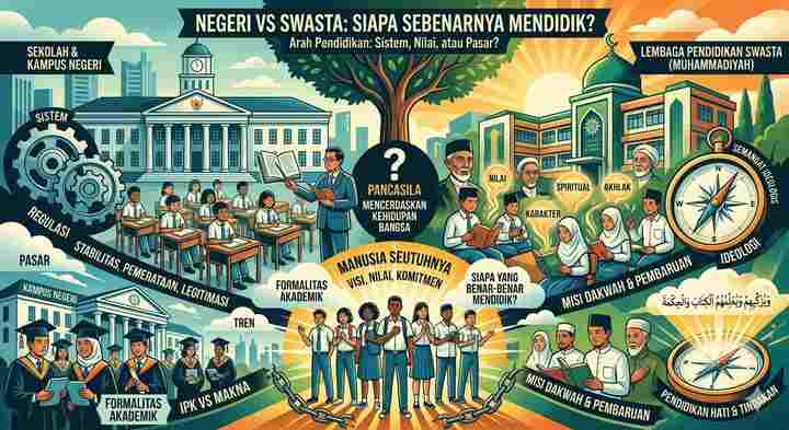 Perdebatan tentang perbedaan sekolah negeri, kampus negeri, dan lembaga pendidikan swasta—termasuk yang berbasis Muhammadiyah—sering kali berhenti pada hal-hal permukaan: biaya, fasilitas, dan label. Padahal, persoalan ini jauh lebih dalam. Ia menyentuh akar ideologis pendidikan, orientasi nilai, hingga arah pembentukan manusia. Pertanyaannya bukan lagi sekadar “mana yang lebih bagus?”, tetapi “siapa yang benar-benar mendidik manusia secara utuh?”