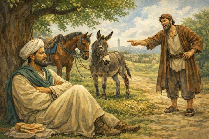 Tidak lama kemudian, tiba-tiba muncul seseorang menunggang keledai. Ia turun dan mengikat keledai berdekatan dengan kuda milik Ibnu Sina. Maksud orang itu supaya keledainya bisa memakan jerami dan rumput pilihan yang dimakan kuda Ibnu Sina.