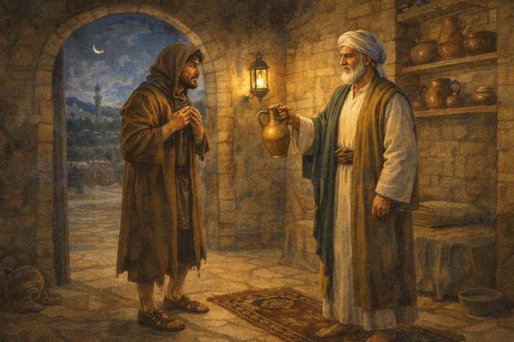 Tetapi alih-alih pergi, pencuri itu berkata, “Apakah kamu keberatan jika aku tinggal di sini bersamamu hari ini, karena aku telah bertekad untuk berpuasa hari ini?”